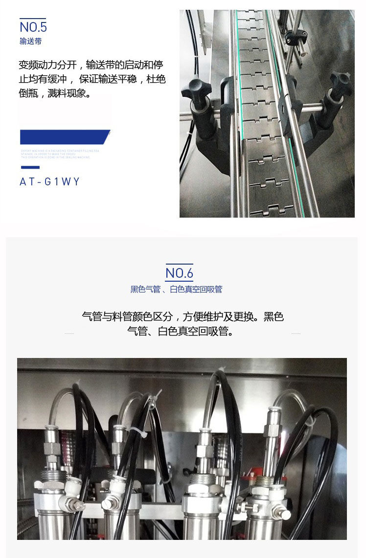 該六頭柱塞式全自動潤滑油灌裝機特的灌裝頭設計及真空回吸系統,確保灌裝過程無殘油滴漏,快慢雙速灌裝,灌裝速度可調,杜絕溢瓶現象。該機采用動力灌裝,無需配裝高位罐,簡化了安裝工序,提高了灌裝效率。履帶式壓蓋機,穩定無噪音,無空壓現象。觸摸屏界面友好,操作簡捷,SIEMENS PLC控制系統,運算速度快,性能穩定,品質卓越。電、氣件均采用精品元件,確保整機運作穩定。
