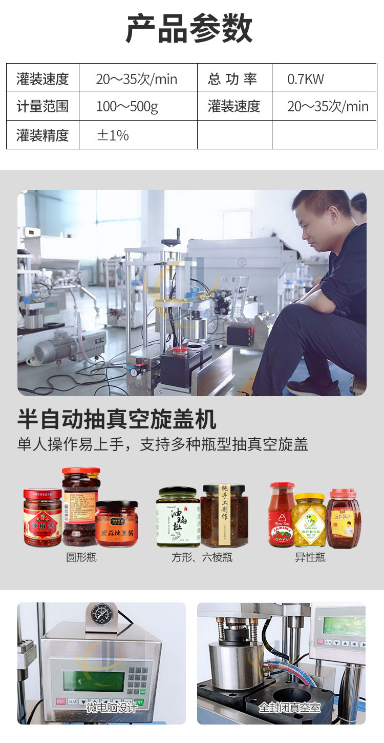 小型醬料灌裝生產線又名醬料灌裝三劍客,由半自動醬料灌裝機+半自動真空旋蓋機+半自動圓瓶貼標機組合而成。該灌裝機適用于辣椒醬、豆瓣醬、大塊肉醬等物品的定量充填分裝。