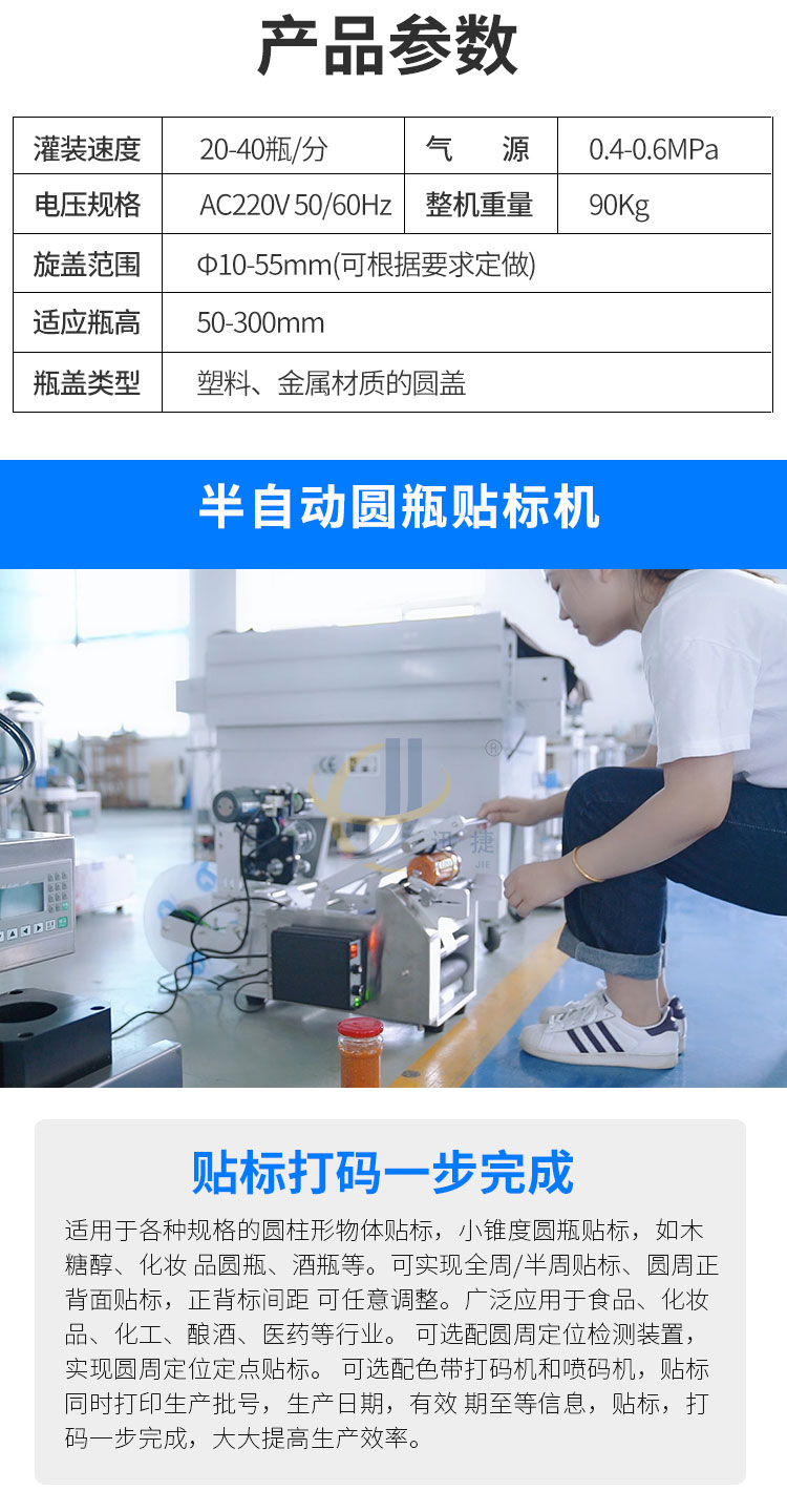 小型醬料灌裝生產線又名醬料灌裝三劍客,由半自動醬料灌裝機+半自動真空旋蓋機+半自動圓瓶貼標機組合而成。