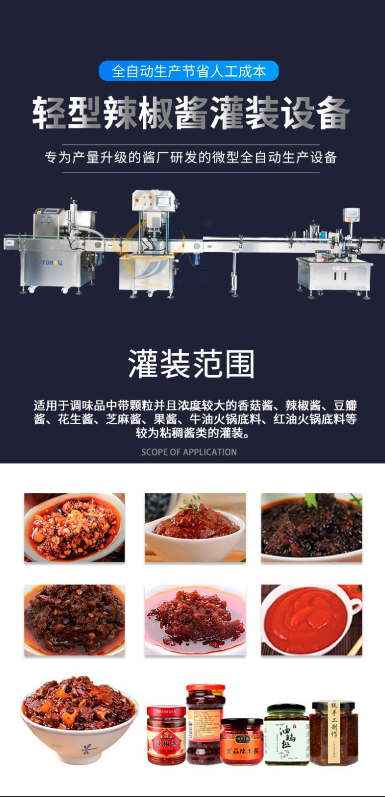 輕型辣椒醬灌裝生產(chǎn)線適用于調(diào)味品中帶顆粒并且濃度較大的香菇醬、辣椒醬、豆瓣醬、花生醬、芝麻醬、果醬、牛油火鍋底料、紅油火鍋底料等較為粘稠醬類的灌裝。