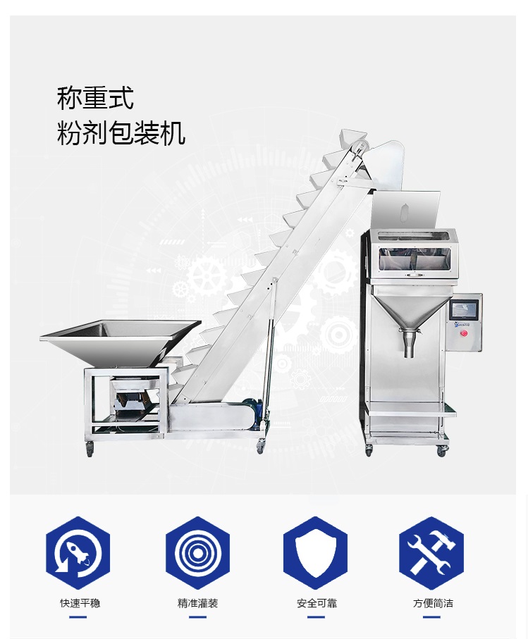 該稱重包裝機(jī)適用于農(nóng)藥、飼料、添加劑、洗衣粉、食鹽、味精、白糖、種子、大米等顆粒粉狀物料的定量稱重包裝。