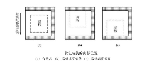 在包裝作業(yè)過程中,卷筒半徑逐漸減小,包裝紙所受張力發(fā)生變化,送紙輥與包裝紙之間的摩擦因數(shù)受環(huán)境溫濕度的影響而發(fā)生波動,加上商標(biāo)印刷誤差,以及送紙、縱封、橫封、切斷各部分速度的差異等因素,使得刀輥的實際切線偏離規(guī)定部位。即使這種位置誤差很小,例如在某—包裝袋上只偏差0.1mm,但包裝機速度很快,有的高達200包/min, 如不加以控制調(diào)節(jié),機器運行1垃i六 后,誤差積累可達20mm,切線嚴重偏離規(guī)定部位,降低了包裝質(zhì)量,甚至造成廢品。如圖所示,圖(a)為合格品; 圖 (b) 為送紙速度偏低,商標(biāo)后移; 圖 (c) 為送紙速度偏高, 商標(biāo)前移。 為了保證包裝袋的正確封切, 必須在卷筒紙供送系統(tǒng)中, 引人商標(biāo)圖案自動位置檢測與控制系統(tǒng)。目前應(yīng)用廣泛的是光電自動定位系統(tǒng)。