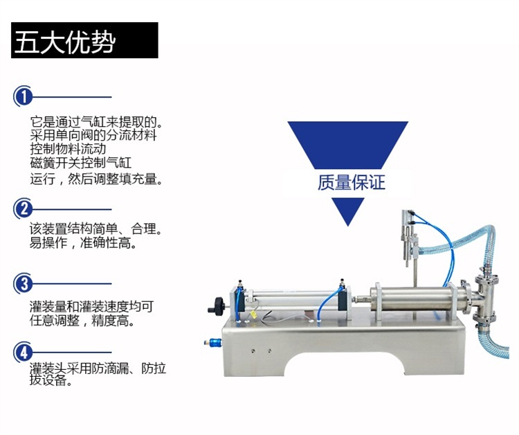 A、該設備通過氣缸帶動一個活塞來抽取和打出物料,用單向閥控制物料流向,并以磁簧開關(guān)控制氣缸的行程,即可調(diào)節(jié)灌裝量。